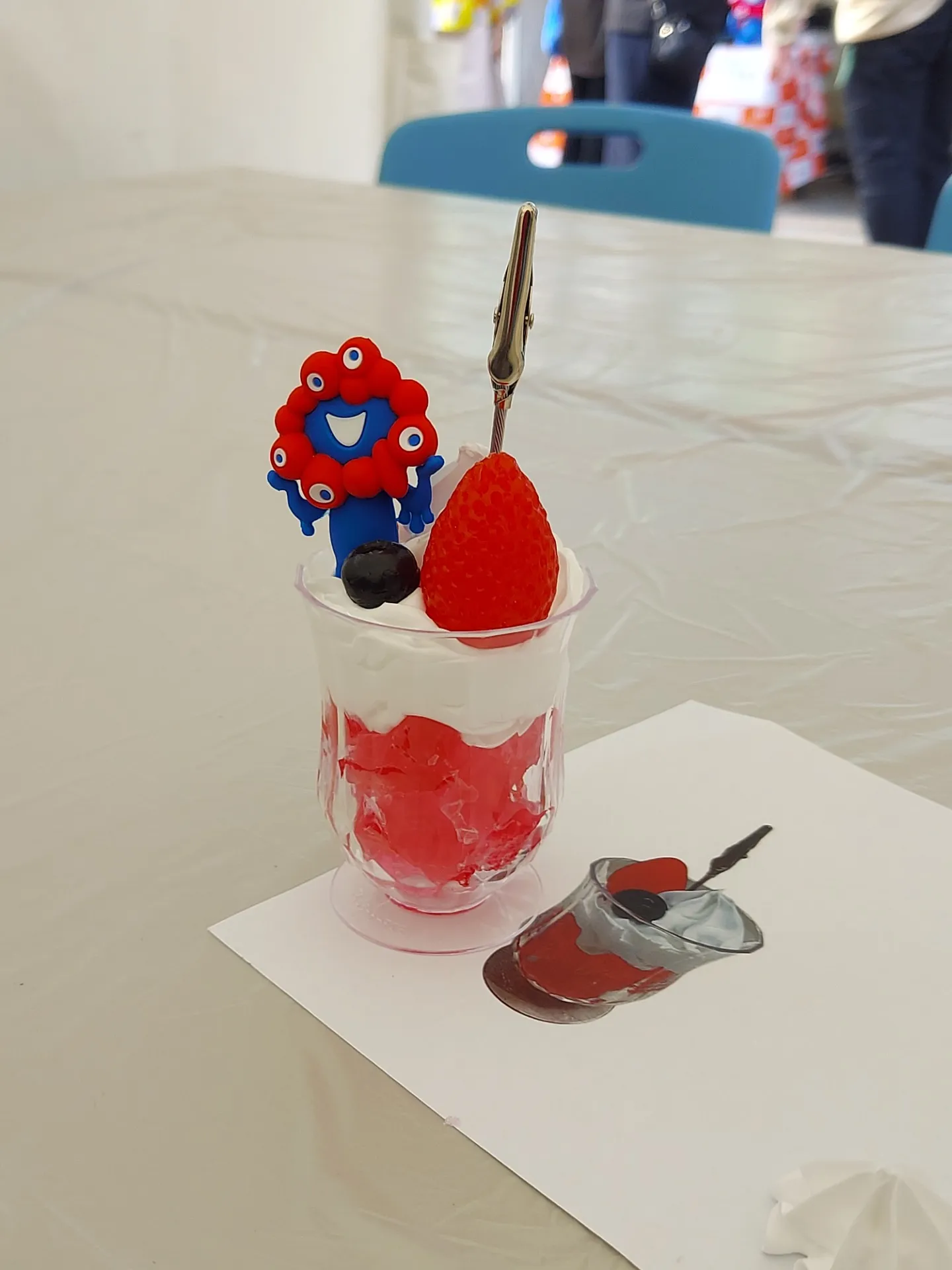 なんとお客さんが、自前で持ってきたミャクミャクをミニパフェにトッピング!!😳✨