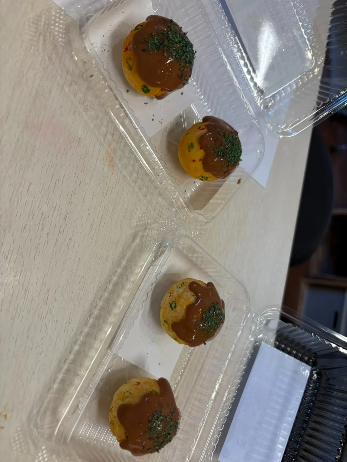 ソースもたっぷりかけて、めっちゃ美味しそうなたこ焼きに仕上げてくれはったで〜!