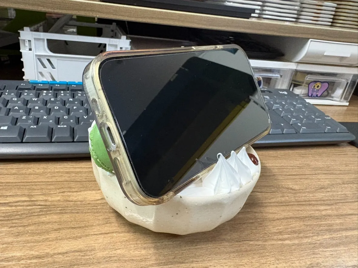 前にしぼったクリームが、スマホをしっかり固定してくれるから、